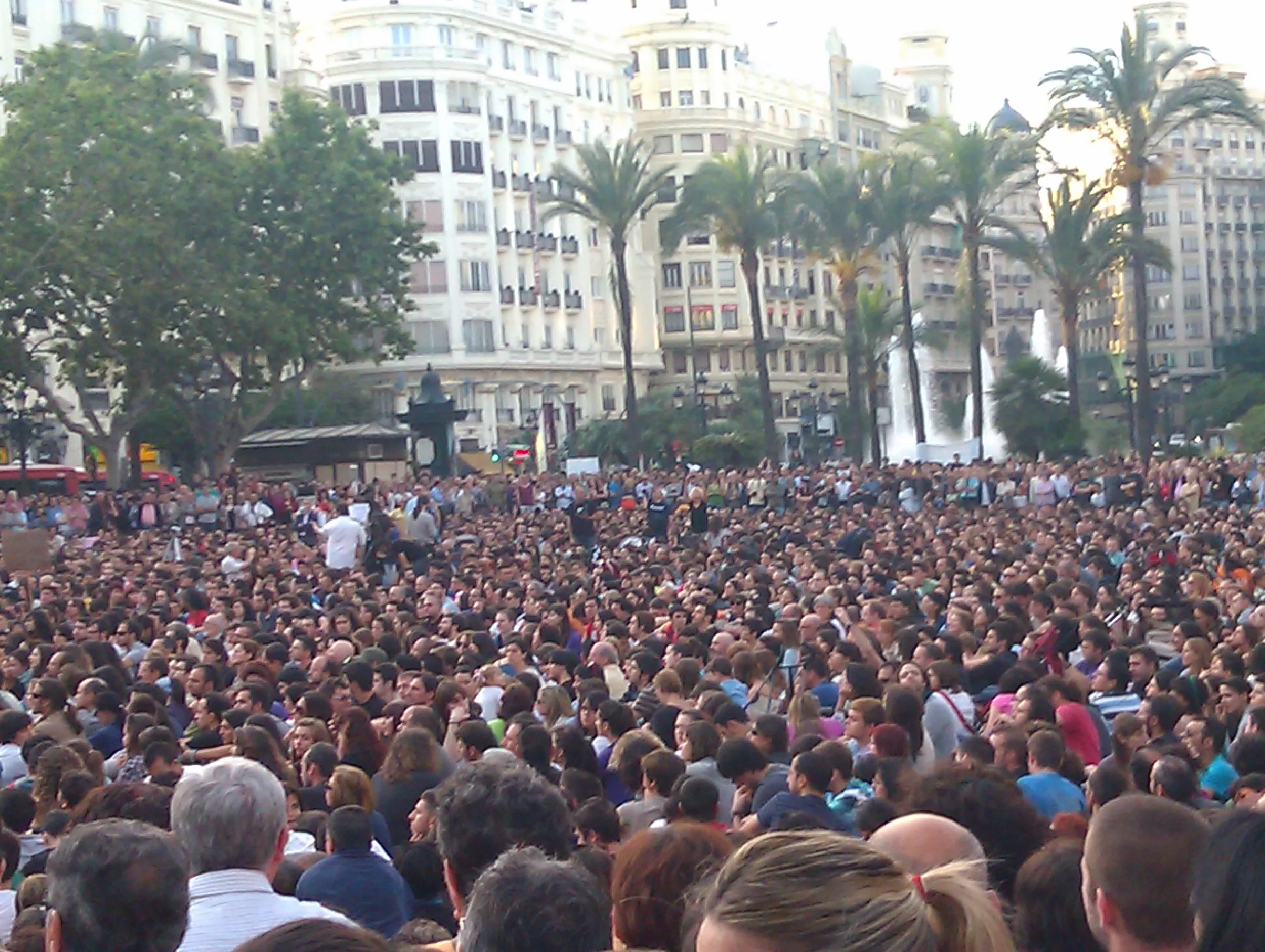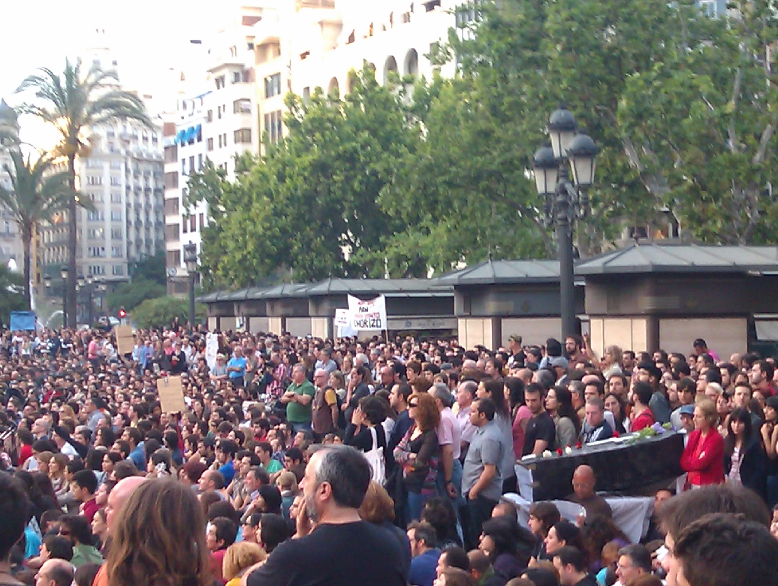 El viernes tuve la suerte de poder asistir a la asamblea que celebraba Acampada València en la llamada oficialmente Plaça de l’Ajuntament, y digo oficialmente porque justo ese día se propusieron la gente de la plaza cambiarle el nombre, por “Plaça del Quinze de Maig”/“Plaza del Quince de Mayo”, no voy a poner aquí la famosa foto porque por desgracia tiene copyright, pero posiblemente la gran mayoría de valencianos que seguimos todo lo referente con el 15M la habremos visto, una foto que simboliza todo lo que está haciendo la acampada, redefiniendo nuevas formas de pensar y actuar, convirtiendo las plazas en un espacio para todo el mundo, una nueva ágora donde debatir, compartir e incluso, porque no, en el futuro hacer negocio, en épocas de crisis el abrir negocios es lo más útil que podemos hacer para mejorar la sociedad.
