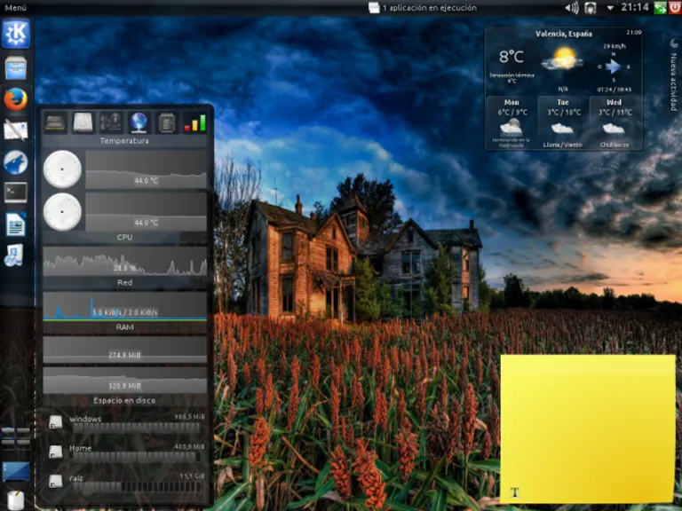Después he instalado algunos widgets en el escritorio, de información del sistema, el tiempo, me he instalado uno bastante personalizable y bonito que se llama PPC y un sticker, siempre útil. Le he puesto un tema oscuro como a mi me gusta, Elegance se llama y un esquema de colores también oscuro. He colocado los botones de la barra de título a la izquierda, estilo Unity y ya está todo listo.