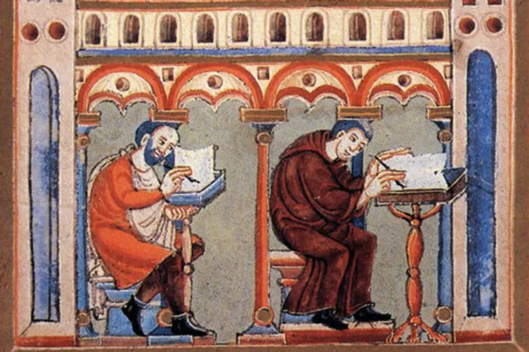 Imagen: Scriptorium de la abadía de Echternach representado en el «Libro de las Perícopas» de Enrique II 1002-1012 d.C. Wikimedia
